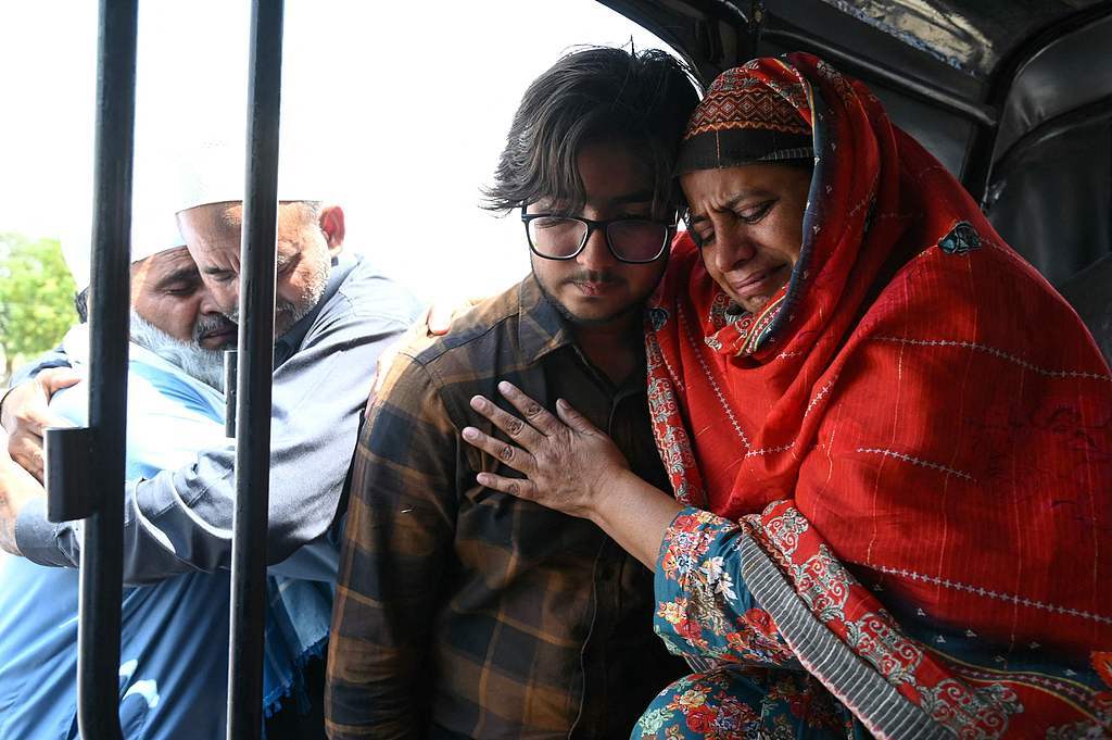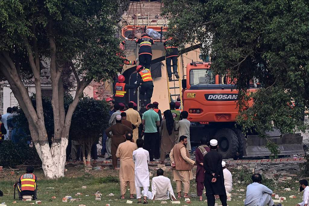 当地时间2025年5月7日,巴控克什米尔穆扎法尔拉巴德,救援人员在遭印度空袭的政府健康与教育综合体的废墟中转移遇难者遗体。