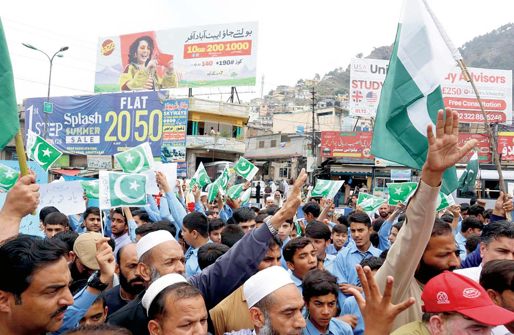 当地时间2025年5月7日,巴基斯坦阿伯塔巴德,民间社会、市民、政党以及中小学学生在法瓦拉广场举行抗议活动,反对印度对巴基斯坦地理边界的侵犯、印度的侵略行为及人命的损失。