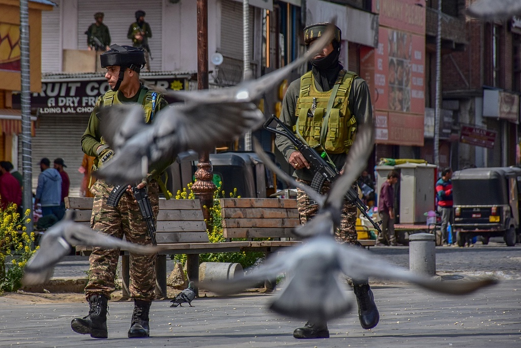 当地时间2025年5月4日,印控克什米尔,印度准军事部队在市中心巡逻。