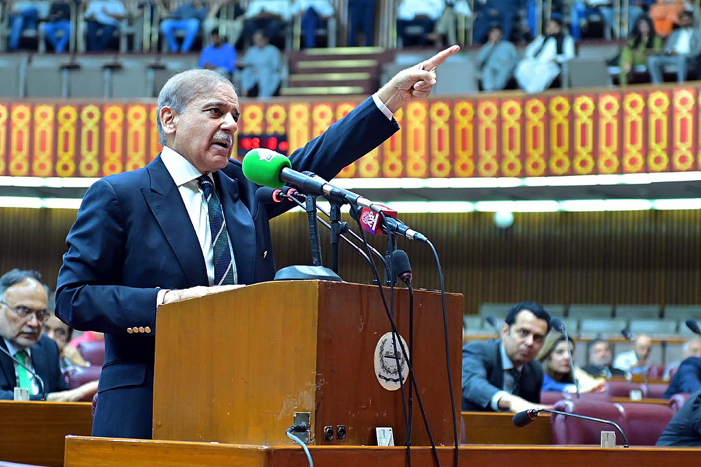 当地时间2025年5月7日,巴基斯坦伊斯兰堡,巴基斯坦总理夏巴兹·谢里夫在议会会议上发表讲话,他表示巴基斯坦将继续坚定捍卫其领空和主权。