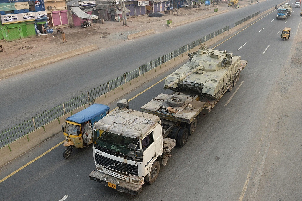 当地时间2025年5月7日,巴基斯坦拉合尔以东约30公里的穆里德克,卡车正在运输军用坦克。