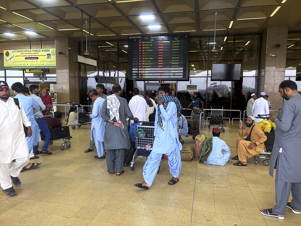 当地时间2025年5月7日,巴基斯坦卡拉奇,真纳国际机场因印度空袭巴基斯坦地区而关闭,滞留的乘客在到达区等待。