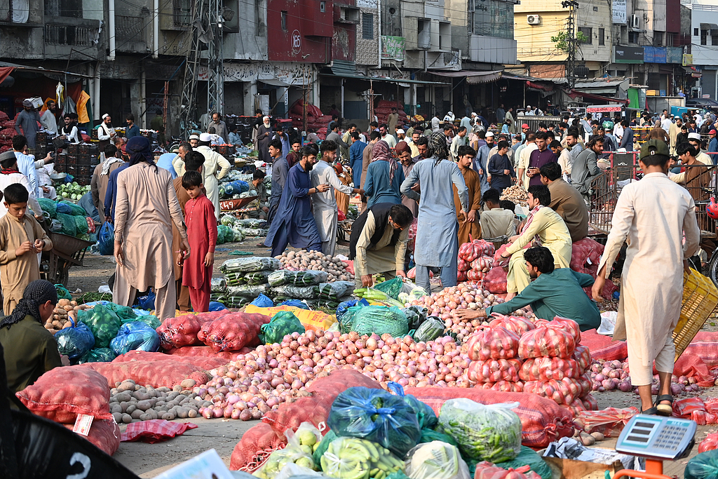 当地时间2025年5月7日,巴基斯坦伊斯兰堡,巴基斯坦民众在印度对巴基斯坦发动空袭后,购买和储存蔬菜及其他应急生活必需品。