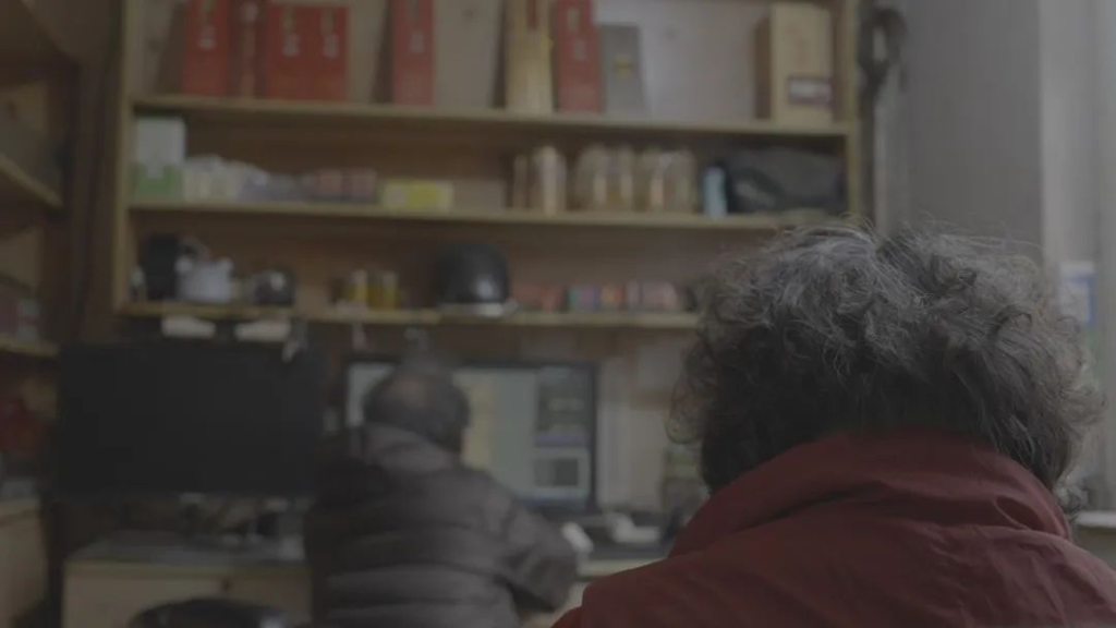 崔禹彤作品《静止》画面。夫妻⼆⼈正在看店,⼀天中⼤部分时间他们都这样对坐着。