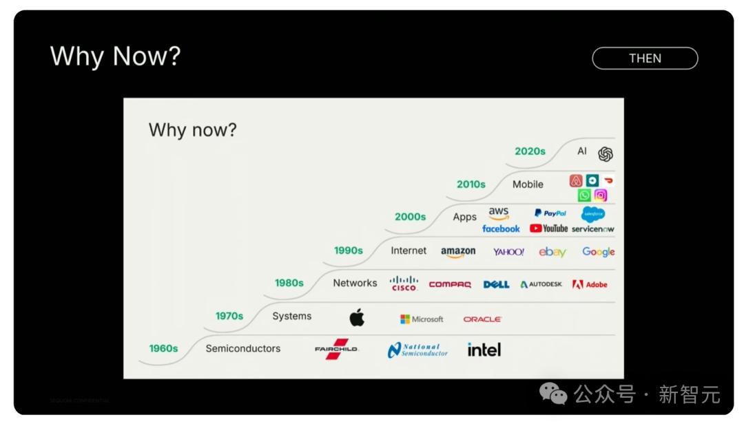 这张图展示了过去几十年间,技术浪潮催生的科技公司。