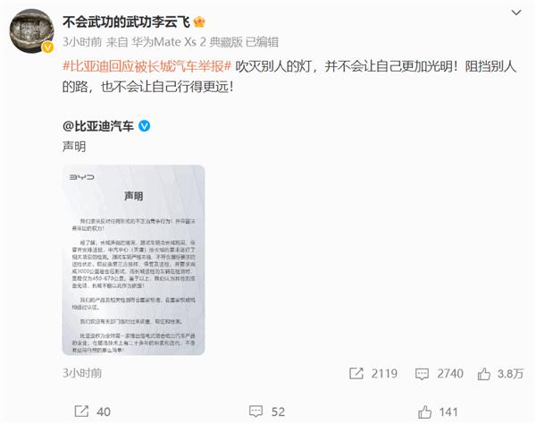 值得一提的是,当年比亚迪汽车就相关举报事件回应后,李云飞在转发其微博时写道 " 吹灭别人的灯,并不会让自己更加光明;阻挡别人的路,也不会让自己行得更远!"