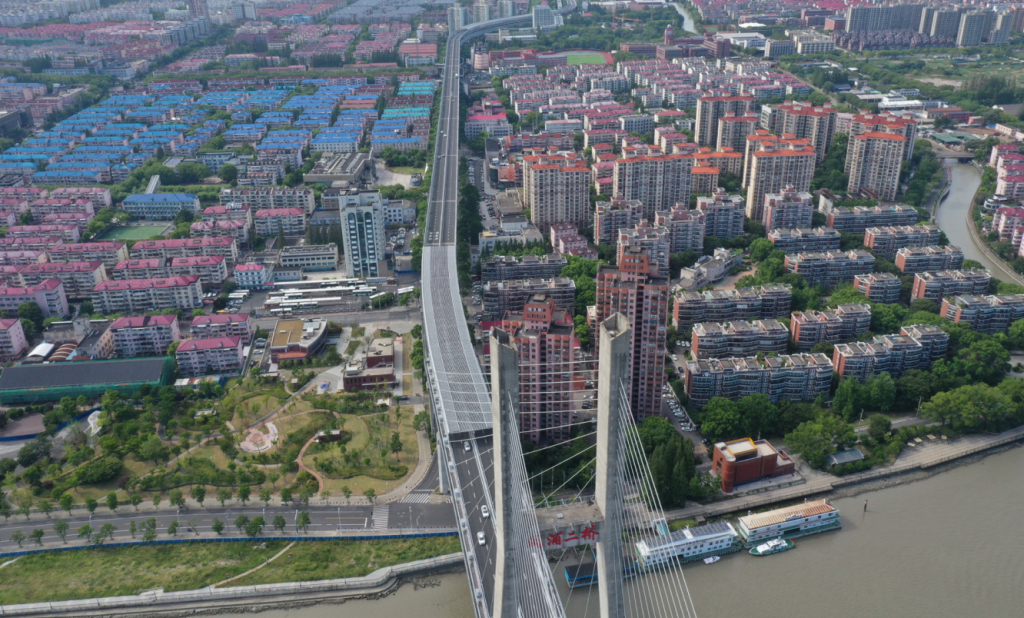 2021年,相同位置航拍,沪闵路向南跨黄浦江上建起闵浦二桥,西闵线北端的闵行渡口已向西迁移
