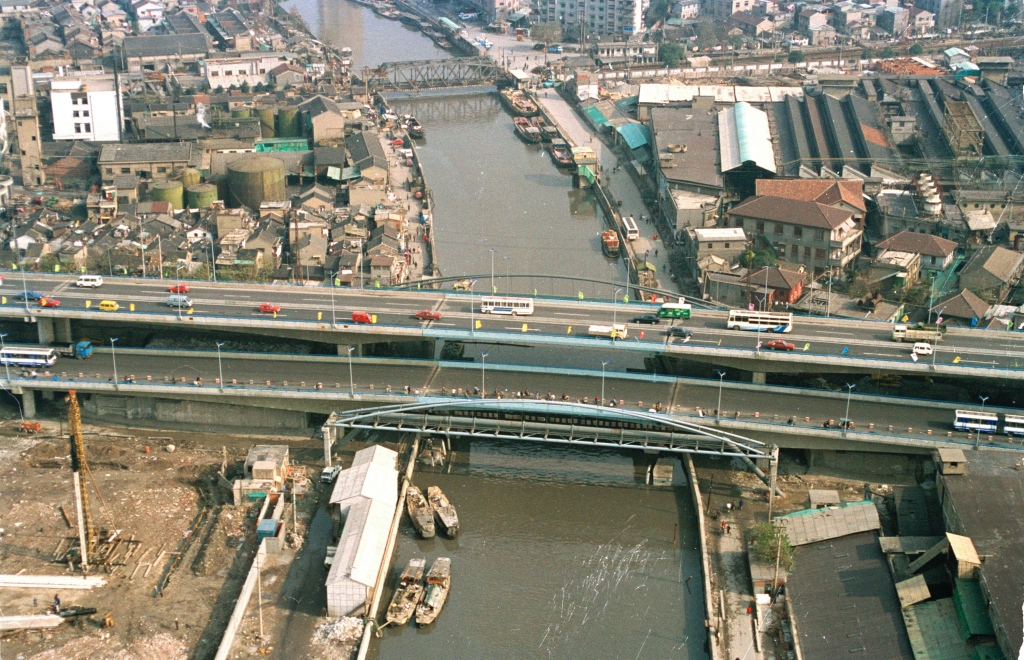 我在华东师范大学就读期间,经常会走过的区域。中山北路-凯旋路桥河段,内环高架建好通车(图片摄于1994年)