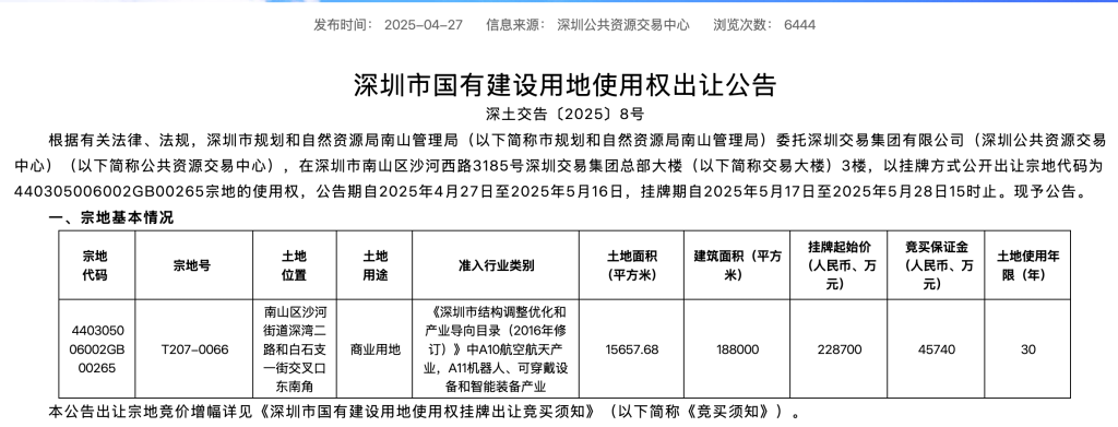 据此前公告显示,该宗土地位于南山区沙河街道深湾二路和白石支一街交叉口东南角,为商业用地,土地面积为15657.68平方米,建筑面积为188000平方米,其中:办公172320平方米、商业5900平方米(含地下商业3900平方米)、文化设施用房9400平方米、物业服务用房380平方米,产权条件均为不得转让。
