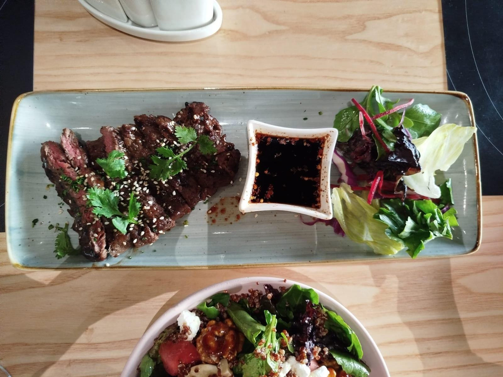 我们以烤甜椒汤开始,天鹅绒般柔软,放纵的开场。虽然辣椒的烟熏味在汤的黄油基础上起到了更大的辅助作用,但总体效果还是令人舒适的——这正是卡拉奇凉爽的夜晚所需要的那种丰富。旁边的蒜蓉面包非常美味:酥脆、香浓、分量充足。