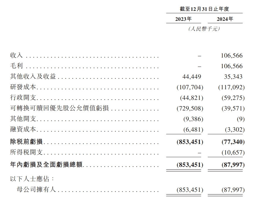 目前,科望医药尚无进入商业化阶段的产品,由于研发成本、运营成本等原因,公司仍处于亏损状态。2023年和2024年,科望医药年内亏损及全面亏损总额分别为8.53亿元及0.88亿元。2024年,科望医药收入1.07亿元,主要来自与安斯泰来的合作、期权及许可协议,2024年净亏损的收窄也得益于这笔收入。科望医药预计,最早可于2028年将公司的临床阶段资产商业化。