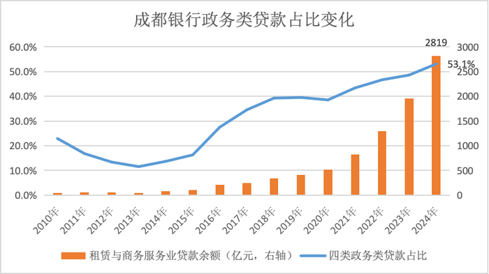 以此为开端,成都银行租赁与商务服务业贷款保持着年均50%的增长,至2024年末该行业贷款余额达到2819亿元,相比2015年末增长了27倍。2024年末,包括租赁和商务服务业在内的四类政务金融贷款占比升至53.1%,相比2010年时还高出30个百分点。