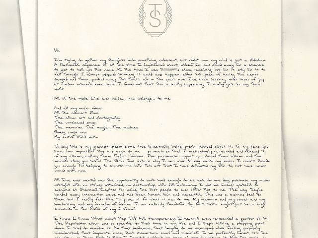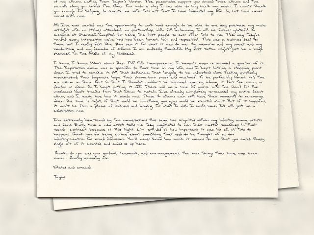 在一封写给粉丝的手写信中,斯威夫特对最终拥有自己早期的音乐作品表示了深深的喜悦。“我创作的所有音乐现在都属于我,”她写道,并强调她的收购不仅包括专辑,还包括相关的视觉效果、音乐会电影和艺术品。