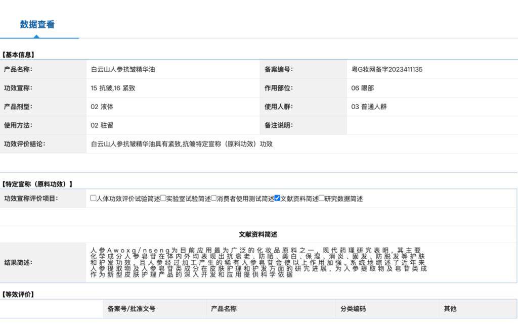 “白云山人参抗皱精华油(粤G妆网备字2023411135)”的人参功效备案信息