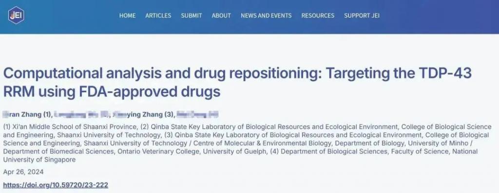 另一篇署名第一作者的论文,题目是《计算分析和药物再利用:针对 TDP-43 RRM 使用 FDA 批准的药物》,聚焦 TAR DNA 结合蛋白(TDP-43)这一神经退行性疾病的病理学标记蛋白——其异常聚集,往往被认为与亨廷顿氏症、肌萎缩侧索硬化症和额颞叶痴呆症等罕见病有关。该论文于 2024 年 4 月在《The Journal of Emerging Investigators》(JEI)发表,JEI 为非核心期刊,主要作为学术训练平台。