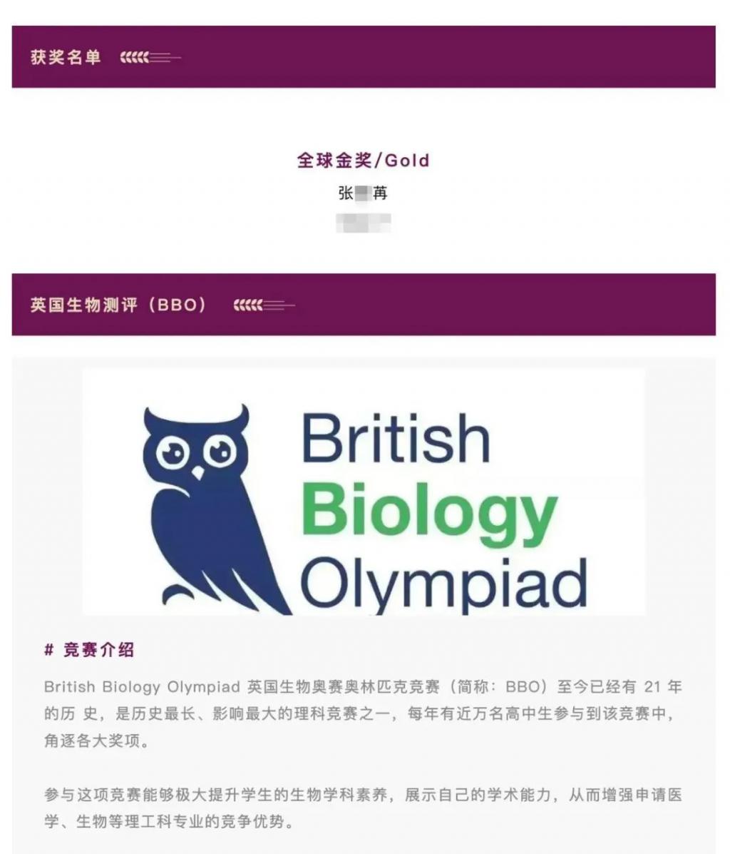 2023 年英国生物奥林匹克竞赛(BBO),张某苒获得全球金奖