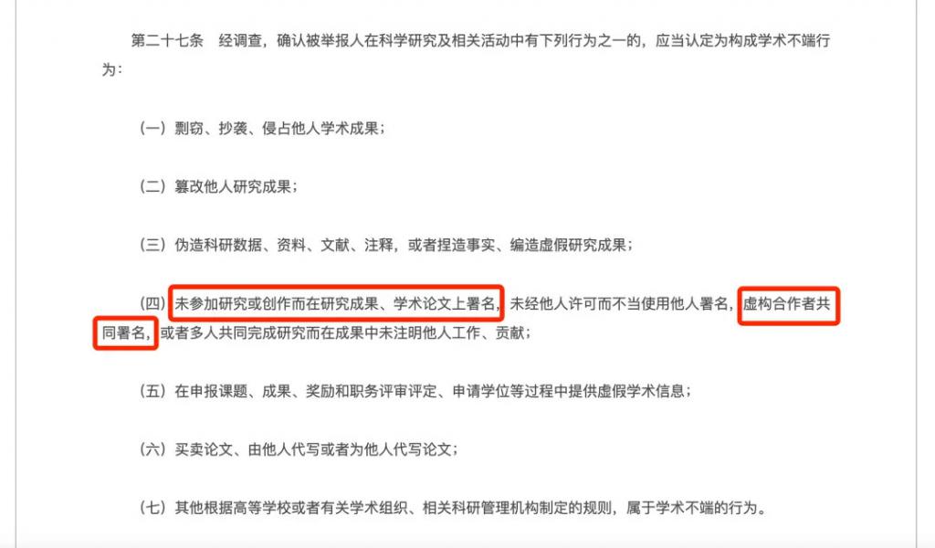 我国对学术不端行为有明确界定。教育部《高等学校预防与处理学术不端行为办法》明确规定," 未参加研究或创作而在研究成果、学术论文上署名 "" 虚构合作者共同署名 " 等均属于学术不端行为。