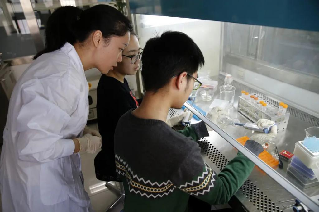 北京师范大学生命科学学院博士生在指导中学生进行菌液细胞转化实验 / 图源:新华社