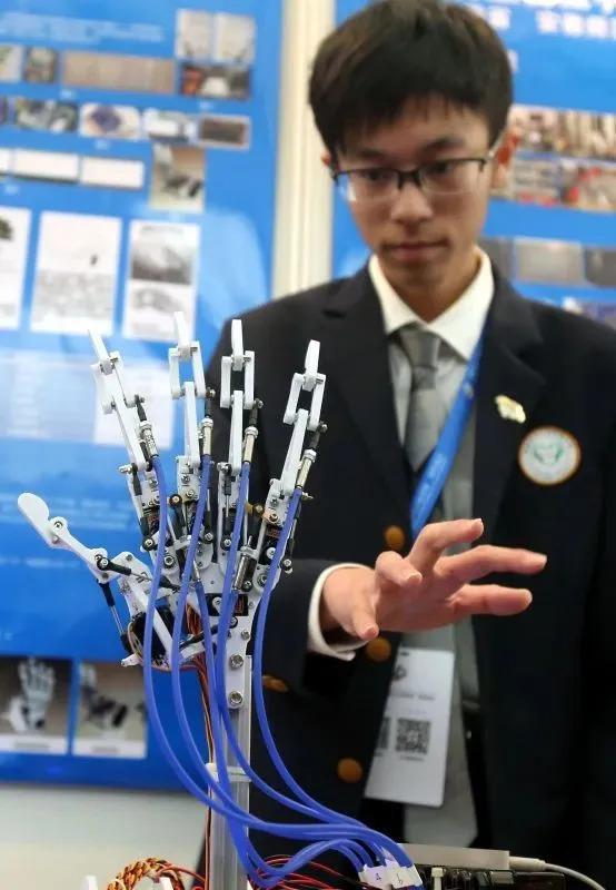 " 明天小小科学家 " 竞赛选手展示自己的科创项目 " 仿生机械手 " / 图源:新华社