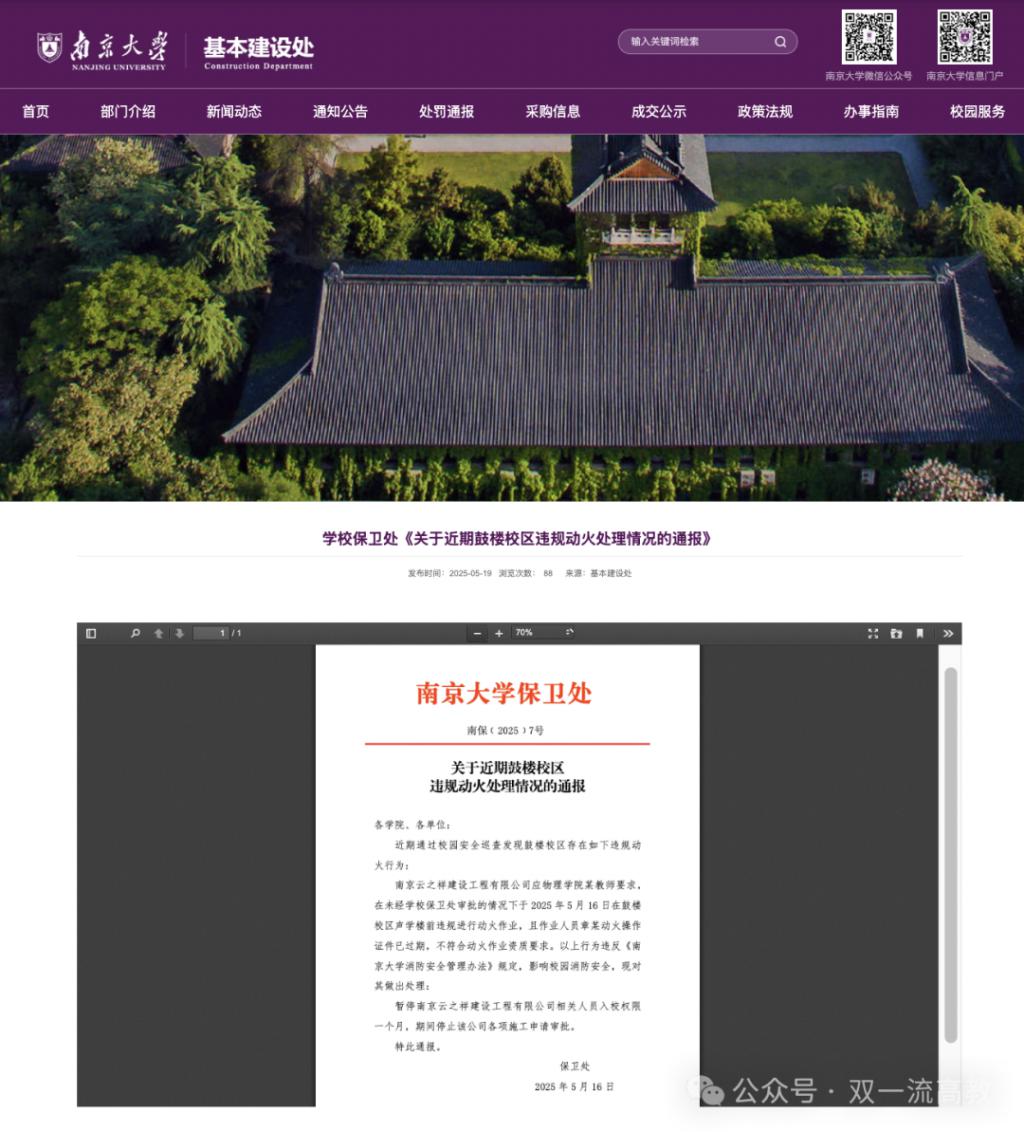 近期(5 月 16 日),南京大学基本建设处网站还发布了《学校保卫处〈关于近期鼓楼校区违规动火处理情况的通报〉》——