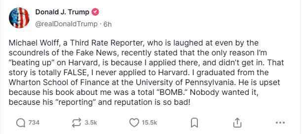 特朗普 2 日在社交媒体上发文说,有记者称他 " 死磕 " 哈佛大学只是因为他当年申请入学被拒,此事纯属造谣," 我根本从未申请过哈佛!本人毕业于宾夕法尼亚大学沃顿商学院。"