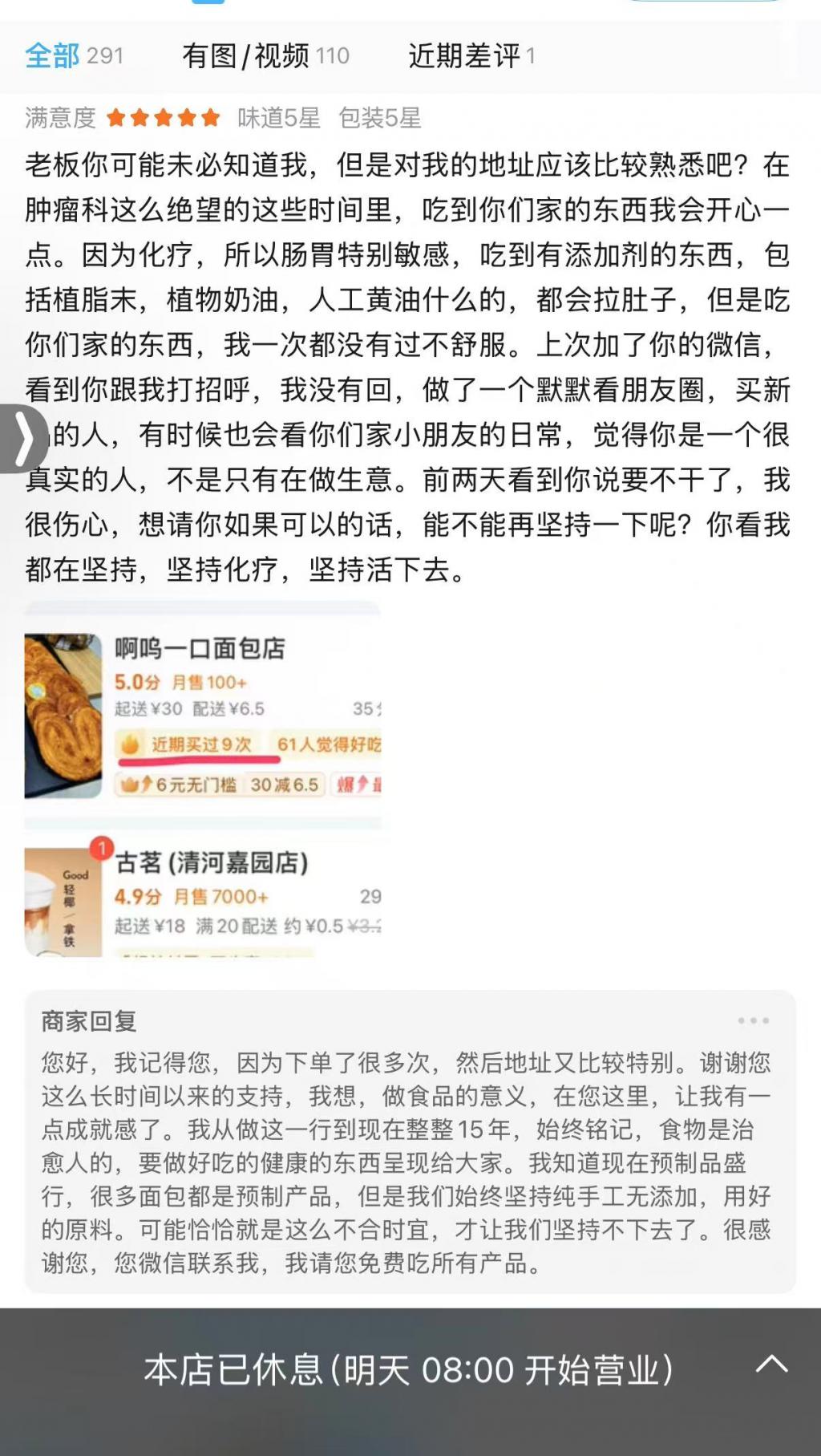 " 一个濒临倒闭的店,收到了这条评价 ",近日,浙江湖州一家面包店店主发布的帖子引发网友关注," 最近在转让和不转让之间反复横跳,看到外卖平台上这条评价,一声叹息。"