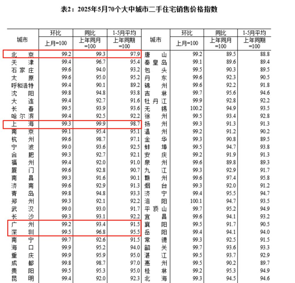 国家统计局数据显示,5 月份,一线城市二手住宅销售价格环比下降 0.7%,降幅比上月扩大 0.5 个百分点。其中北京、上海、广州和深圳分别下降 0.8%、0.7%、0.8% 和 0.5%。二、三线城市二手住宅销售价格环比均下降 0.5%,降幅均扩大 0.1 个百分点。