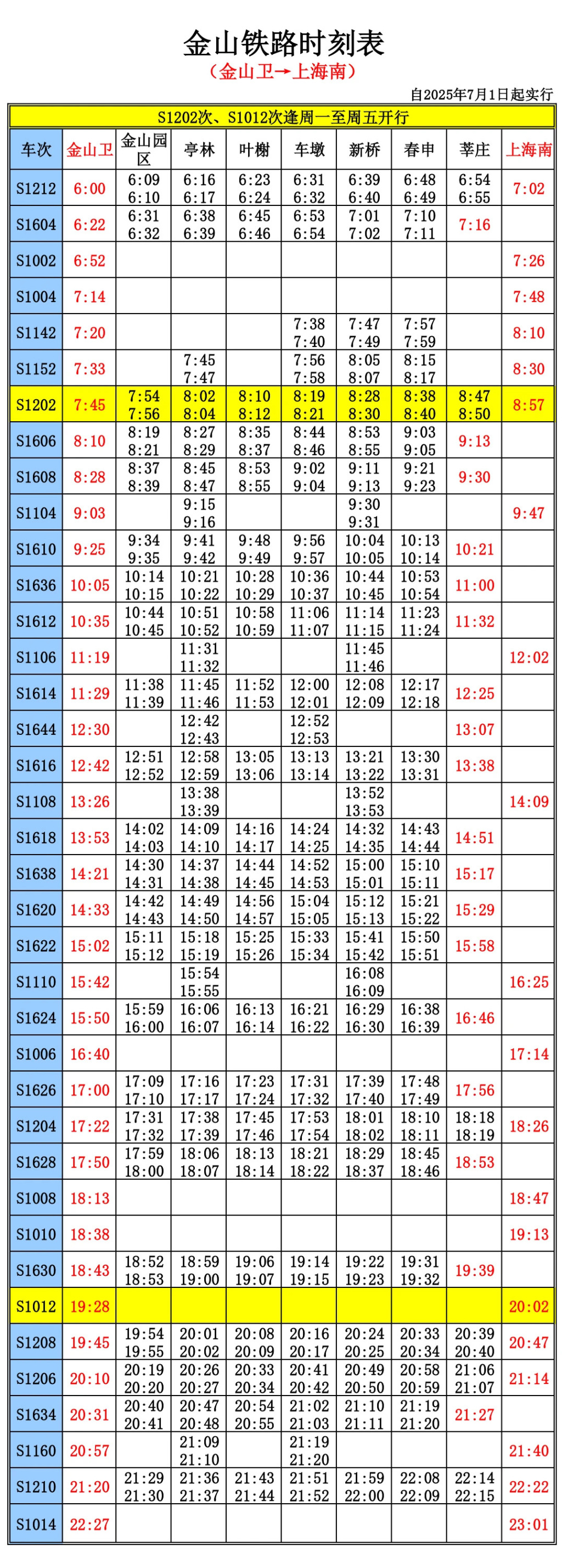 针对最新时刻表,金山铁路部门提示,工作日方案与节假日方案均为同一图,区别在于:图中黄色标注的车次(S1003次、S1011次、S1202次、S1012次)节假日不运行,其余车次不变。