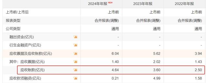 另一方面,公司应收账款也显著增加,从2022年的2.5亿元涨至2024年末的4.64亿元。