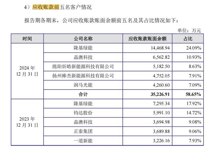 2024年,应收账款余额前五名客户中,新增扬州棒杰和绵阳炘皓新能源科技有限公司(以下简称“绵阳炘皓”),2家公司对应的应收账款账面余额分别为4752.05万元、5182.50万元。
