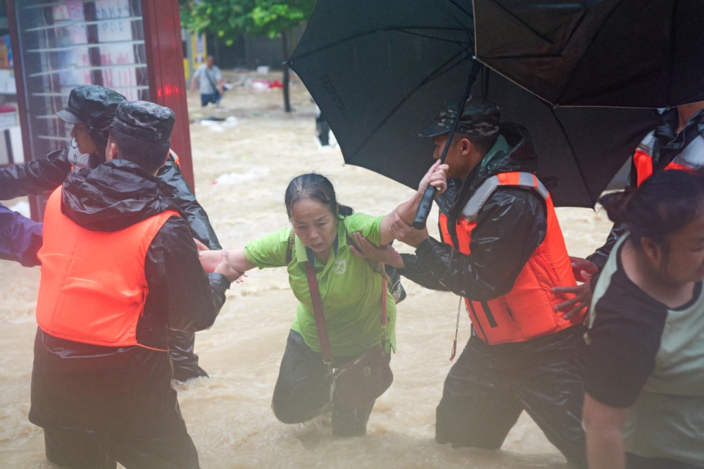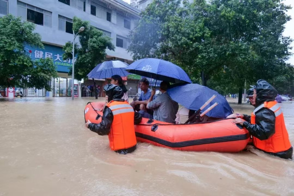 受持续强降雨及上游来水叠加影响,榕江县城境内多条河流水位持续上涨,县城多处低洼地带被淹,武警官兵在县城主要街道采取徒步涉水和乘坐皮划艇的方式,搜救转移被困群众。