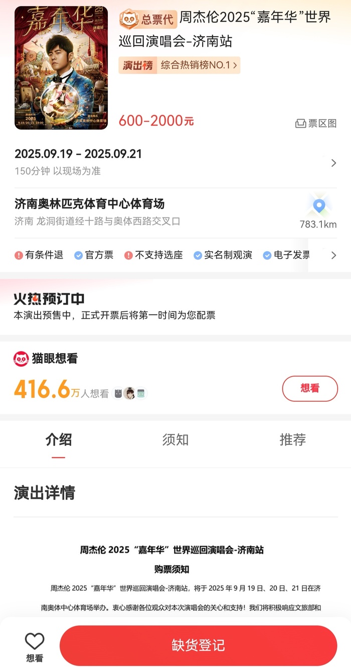 猫眼电影演出玩乐小程序显示,周杰伦“嘉年华”世界巡回演唱会-济南站演出时间为9月19日—9月21日,其票价为600-2000元,场地是济南奥林匹克体育中心体育场。截至发稿前,该场演出约有416.6万人想看,目前三天的唱出票都处于缺货登记状态。