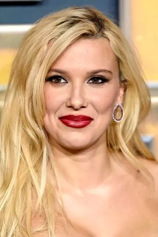 这位好莱坞女星在红毯上自信地摆姿势,一头金发披在肩上。米莉的妆容与她的服装相匹配,她选择了暗红色的嘴唇和烟熏色的眼睛来完成这个迷人的造型。