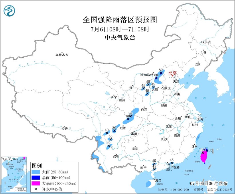 预计,7月6日08时至7日08时,台湾岛、广东西南部、广西东南部、海南岛西部、内蒙古南部、山西北部、陕西北部和西南部、四川盆地西北部、川西高原南部、云南中西部等地部分地区有大到暴雨,其中,台湾岛中南部有大暴雨(100~230毫米)。上述部分地区伴有短时强降水(最大小时降雨量20~50毫米,局地可超过70毫米),局地有雷暴大风等强对流天气。