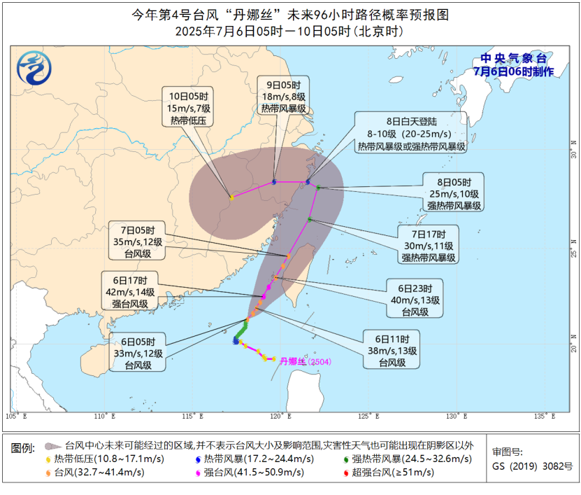 大风预报:7月6日08时至7日08时,南海东部和南部的部分海域、台湾海峡、台湾以东洋面、巴士海峡、东海西南部、广东东部沿海、福建沿海、浙江沿海、台湾岛沿海将有6~8级大风,阵风9~10级,其中南海东北部、东海西南部的部分海域、台湾海峡、台湾以东洋面、巴士海峡西部、台湾岛沿海的风力有9~11级,阵风12~13级,“丹娜丝”中心经过的附近海域或地区风力可达12~14级、阵风15级。