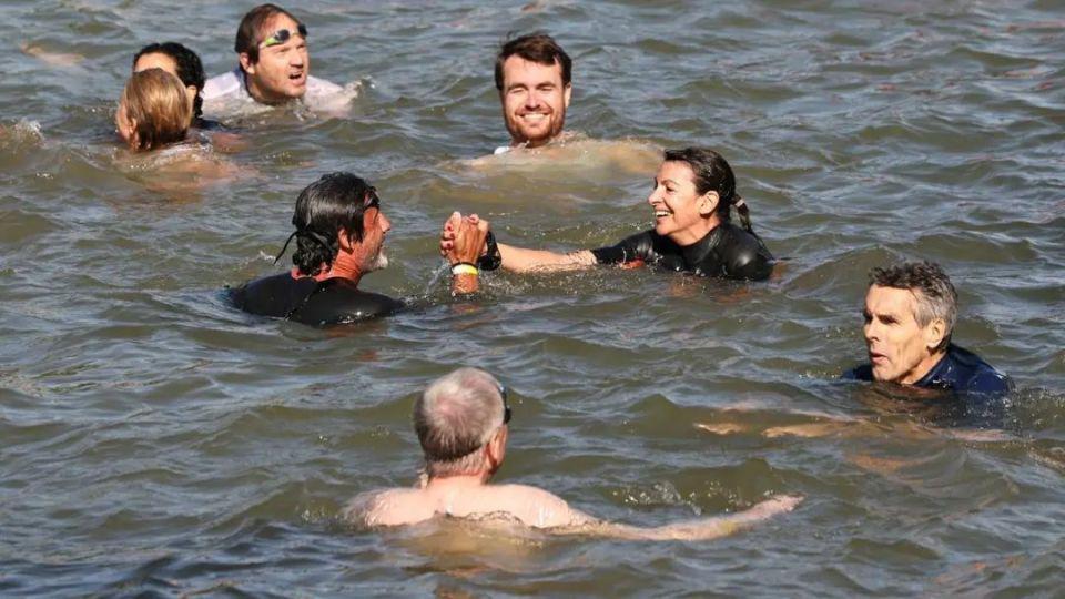 2024 年 7 月 17 日,巴黎市长伊达尔戈(中右)在塞纳河中游泳,向外界展示几年来的河水净化成效。新华社记者高静摄