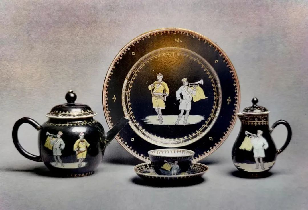 英国国立维多利亚与艾尔伯特博物馆里,有一套瓷器组,饰以“吹乐人”图案。其中一个瓷盘,和观复博物馆藏“墨地粉彩小号手图盘”极为相像。黑色背景上的两个乐手穿着土耳其服饰,一个吹法国圆号,一个吹小号,是西方人对 “异域东方人”的幻想。