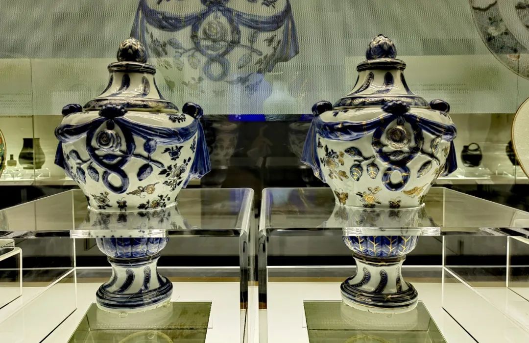 在造型上,景德镇工匠用瓷土复制来自德国、英格兰、荷兰和法国的银器器型,并且对不同器型加以重新组合或改造。如展柜中成对的“青花描金绶带花蝶纹折腰盖瓶”,瓶身形制由古希腊双耳细颈瓶演化而来。