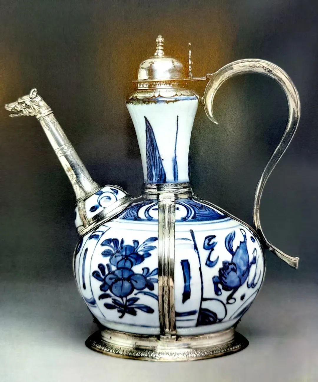 到17世纪早期,瓷器作为餐具或室内装饰品被销售到欧洲,欧洲人开始给瓷器装上精致繁复的金属附件。一方面为了突出瓷器的精美,另一方面为使这些远东器物,更完美地融合进欧洲的室内装潢。