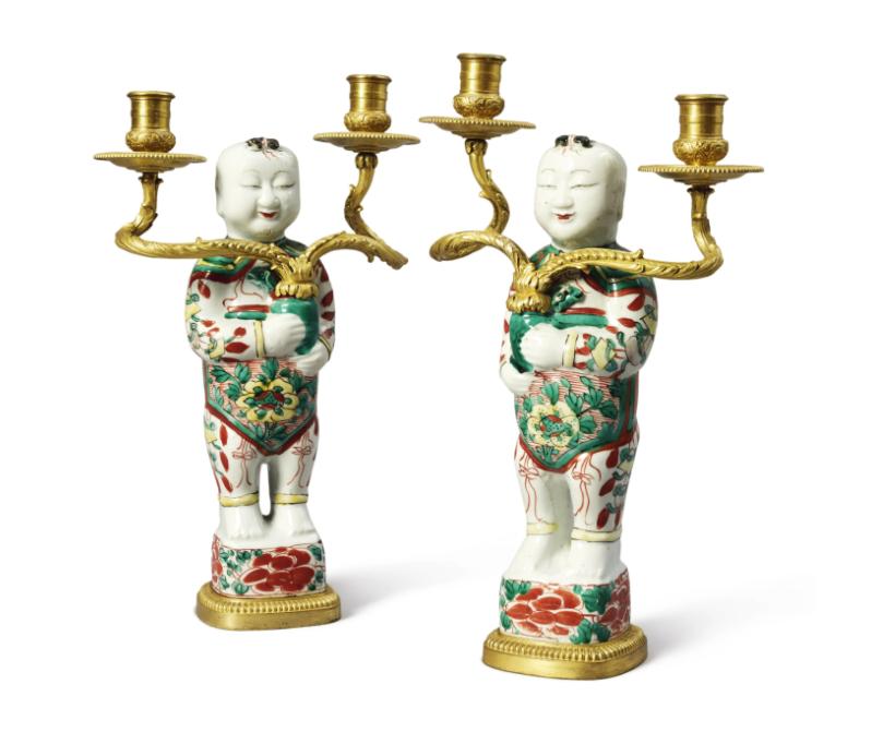 在一对中国瓷娃的手捧中,镶嵌铜鎏金烛台,瓷器:清康熙,烛台附件:铜鎏金 18 世纪 ,法国,苏富比