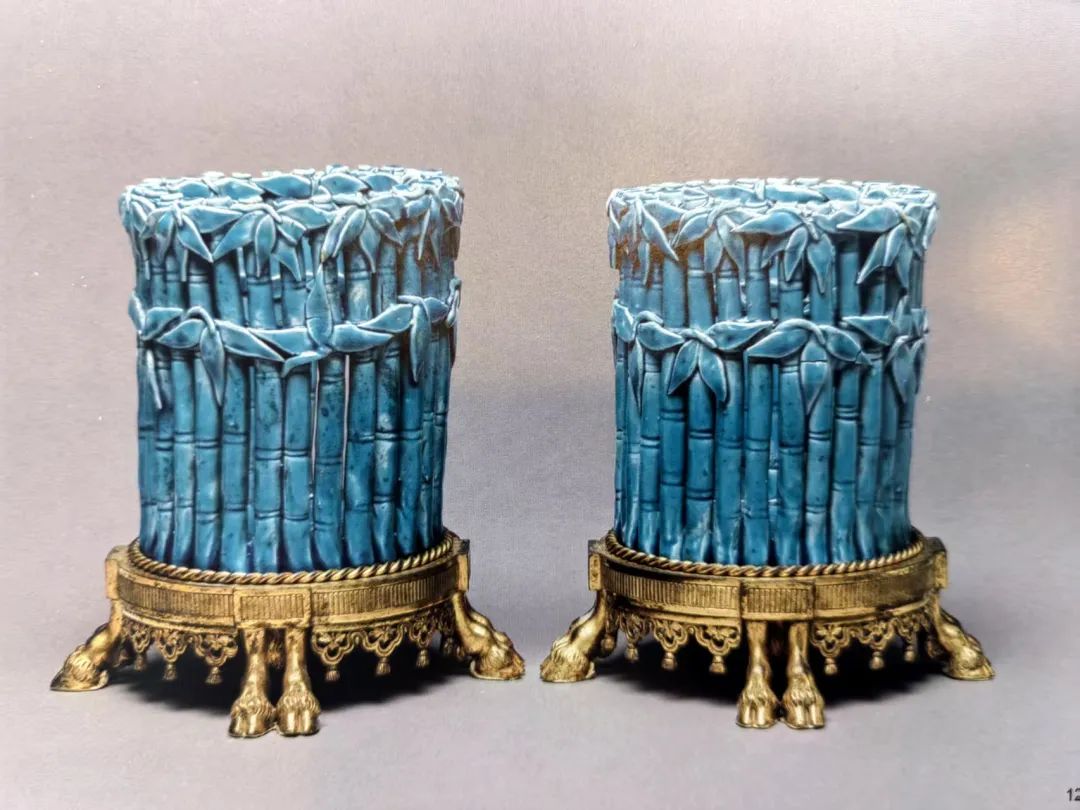 两只笔筒,镶嵌法国鎏金青铜底座,笔筒:康熙年间,金属附件:1780-1790年,V&A藏