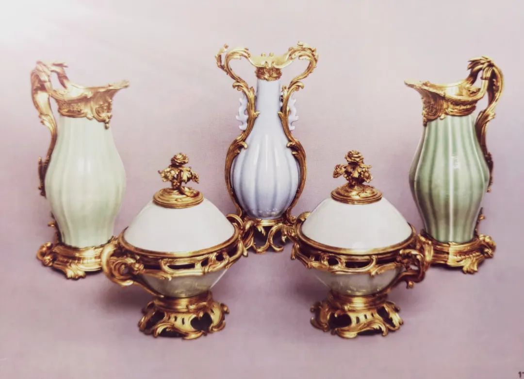 两只碗,两个水壶和一件花瓶组合,镶嵌法国鎏金青铜附件。碗和水壶:乾隆年间,金属附件:1740-1760年,V&A藏
