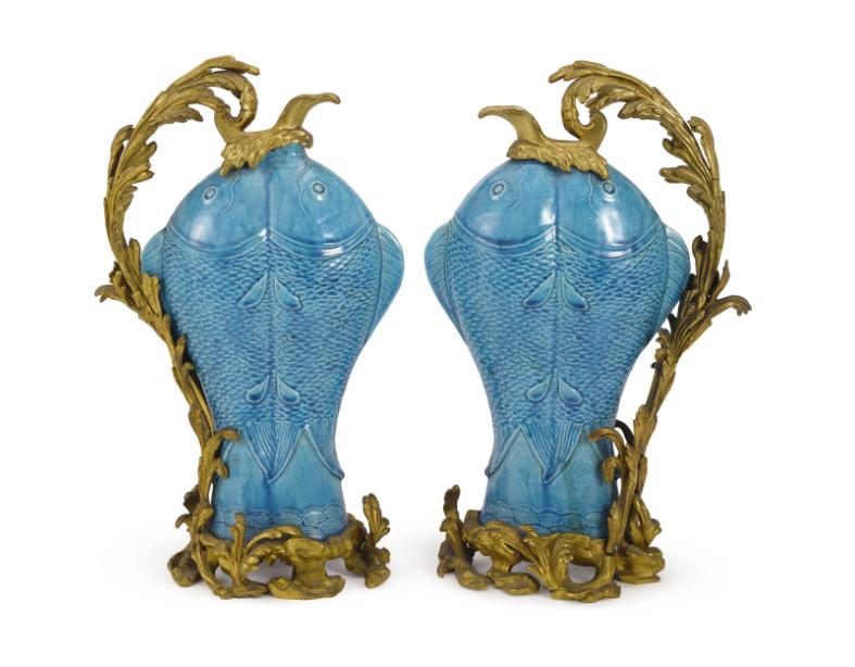 一对鎏金青铜镶嵌的中国绿松石瓷双鲤鱼花瓶,19世纪