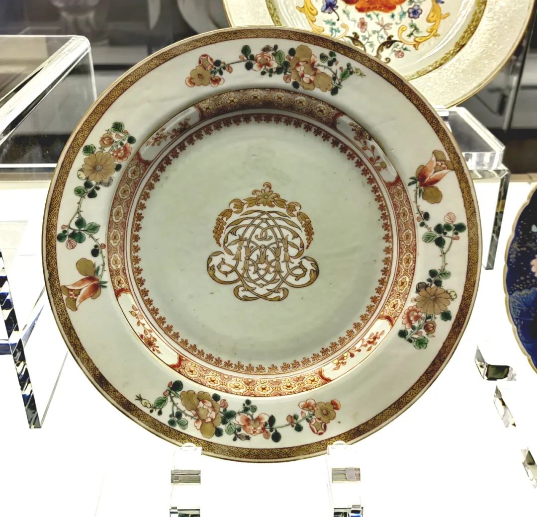 订制瓷盘的主人,根据馆藏介绍说明极可能是托马斯·雷(Thomas Ray)。他的身份是第一位获得奥地利当局授权,与远东进行贸易的私人船主。瓷盘中心婉转交结的金彩藤蔓纹饰,正是该位私人船主的姓名缩写。