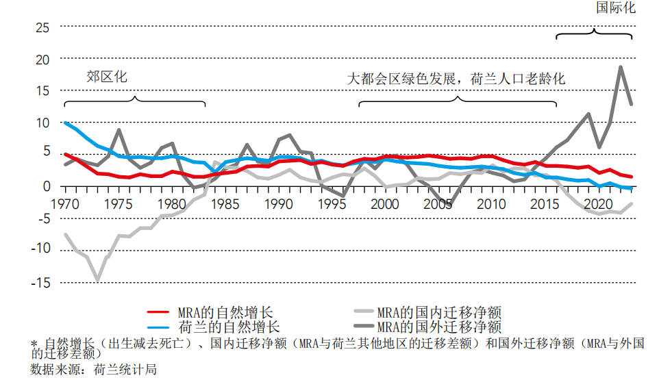 总体来看,阿姆斯特丹大都会区的人口、经济和就业增长速度均快于荷兰平均水平。阿姆斯特丹大都市区近二十年人口持续增长,自2005年以来,大都市区的人口增长率每年为0.6%至1.4%,远高于荷兰的人口增长率(每年为0.3%至1.0%)。大都市区人口吸引的人口不仅来自荷兰,而且越来越多地受外国移民净流入的推动。其中,乌克兰的难民(2022年移民净额的29%)、亚洲的移民(2022年移民净额的31%)是主要迁入群体。荷兰中央统计局(CBS)和荷兰环境规划局(PBL)预计,由于外国人口的大量涌入,未来大都市区域的人口增长速度仍将快于荷兰其他地区,也将快于过去二十年的增长速度。