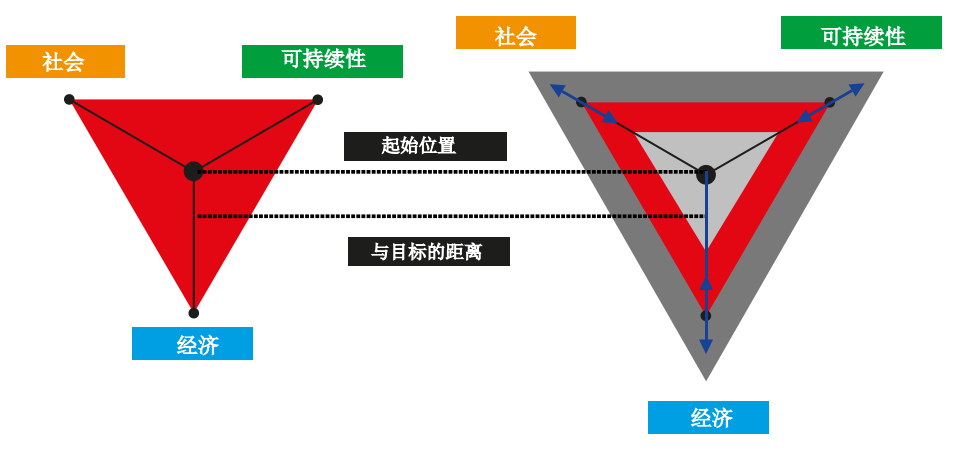 阿姆斯特丹大都市区的广泛繁荣需要在经济、社会和生态三个维度作出抉择。将三个维度分别放置在三角形的三个顶点,从三角形内部的起点出发(见图5的左半部分),距离三个维度的目标都有一段距离,这表明三个维度并非都能完全实现,需要在经济、社会和可持续发展之间作出取舍。例如,加强可持续发展努力将缩短与可持续发展目标的距离,可能会在短期内影响经济增长(由于生产过程的必要调整、经济活动的可能发生转移等),在没有附加政策的情况下,可能会出现能源短缺,因为低收入家庭在能源上的支出占比相对较高,而能源价格在短期内将会上涨。