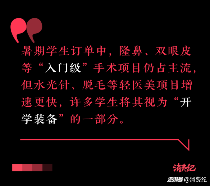 医美机构咨询师李莉证实,暑期学生订单中,隆鼻、双眼皮等“入门级”手术项目仍占主流,但水光针、脱毛等轻医美项目增速更快,许多学生将其视为“开学装备”的一部分。