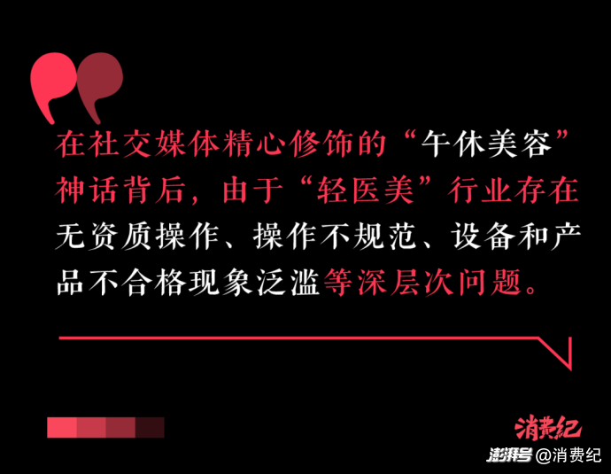 在社交媒体精心修饰的“午休美容”神话背后,由于“轻医美”行业存在无资质操作、操作不规范、设备和产品不合格现象泛滥等深层次问题。也因此出现“美容”变“毁容”“要美”变“要命”的案例。