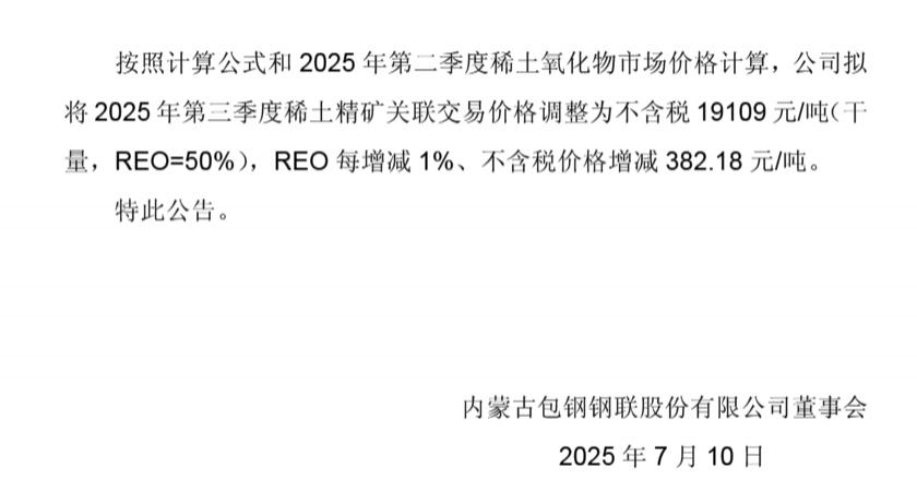 7 月 10 日晚间,北方稀土、包钢股份双双公告,拟将 2025 年第三季度稀土精矿关联交易价格调整为不含税 19109 元 / 吨(干量,REO=50%,下同),REO 每增减 1%、不含税价格增减 382.18 元 / 吨。