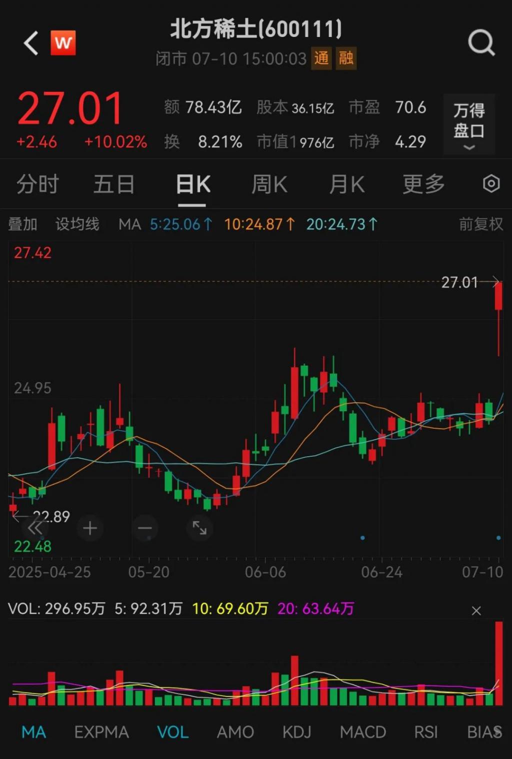 受业绩大幅预增影响,北方稀土今日放量涨停,成交额达 78.43 亿元。截至收盘,股价报 27.01 元 / 股,总市值逼近 1000 亿元。